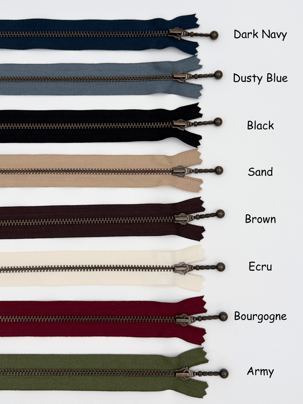 Brass zipper with ball pull and polyester tape This non-separating zipper is ideal for accessories and small bags.