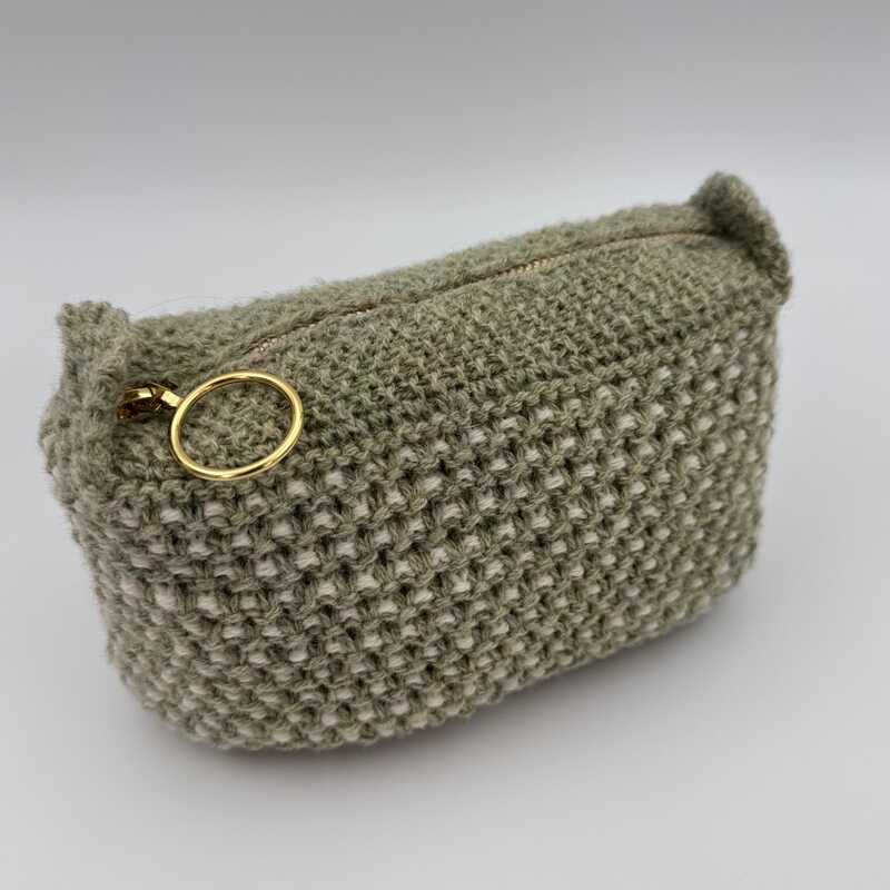 Pebbles Clutch is worked in a two-colour slip stitch pattern, with tabs and plackets for the zipper in seed stitch.