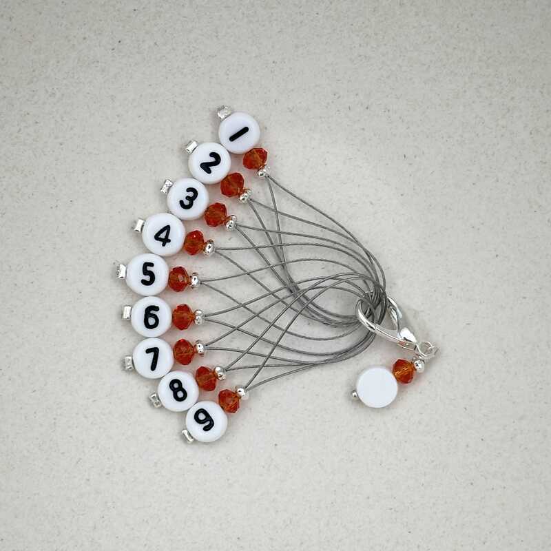 A set of 9 stitch markers with the numbers 1 to 9 - assembled in a silver lobster lock which can also be used as a row marker.
