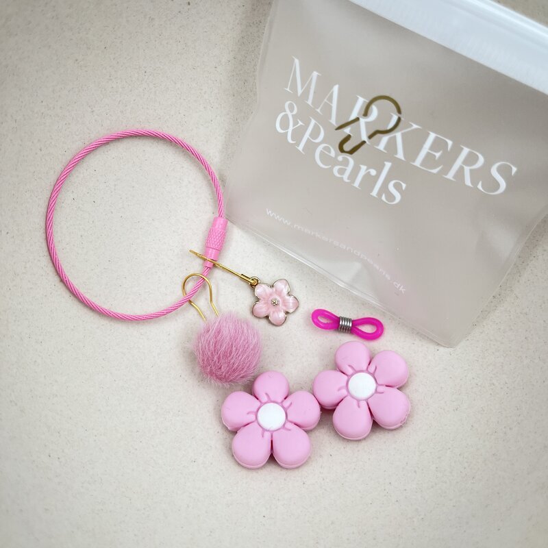 Det hele er pakket i en fin ziplockpose med MARKERS & Pearls-logo – perfekt til opbevaring af dit strikkegrej.