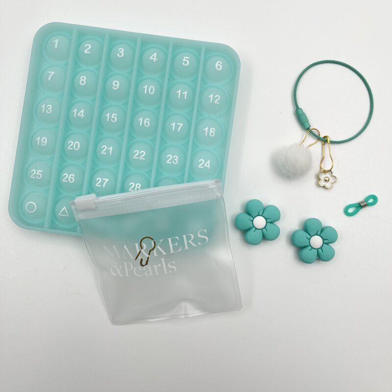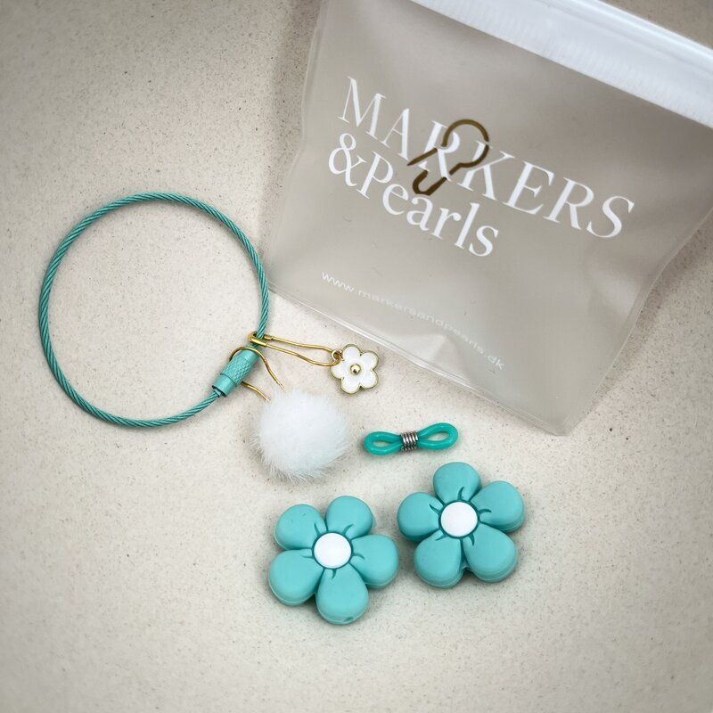 Det hele er pakket i en fin ziplockpose med MARKERS & Pearls-logo – perfekt til opbevaring af dit strikkegrej.