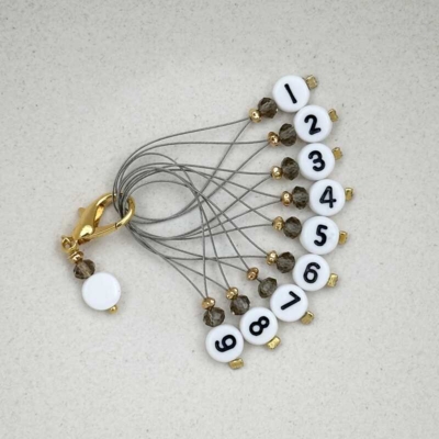 Et sæt a 9 maskemarkører med tallene 1 til 9 - samlet i en dekorativ forgyldt lobsterlås, som også kan bruges som rækkemarkør.
