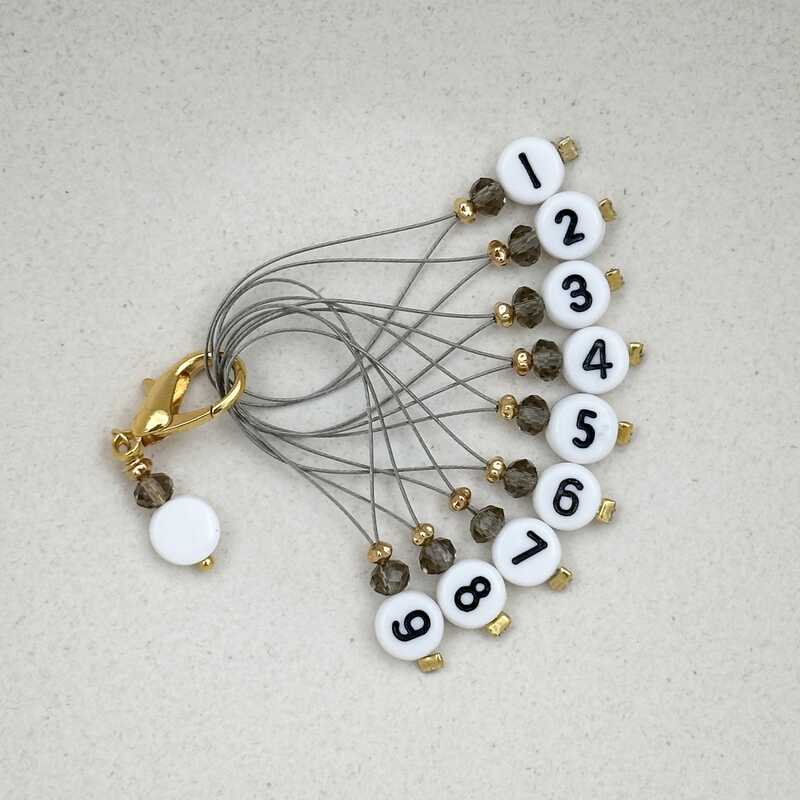 Markørerne er lavet af perler med tal, facetslebne perler i brun og forgyldte blomsterformede perler.
