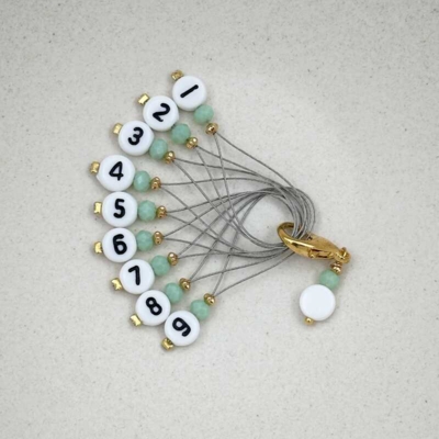 Markørerne er lavet af perler med tal, facetslebne lysegrønne perler og forgyldte blomsterformede perler.