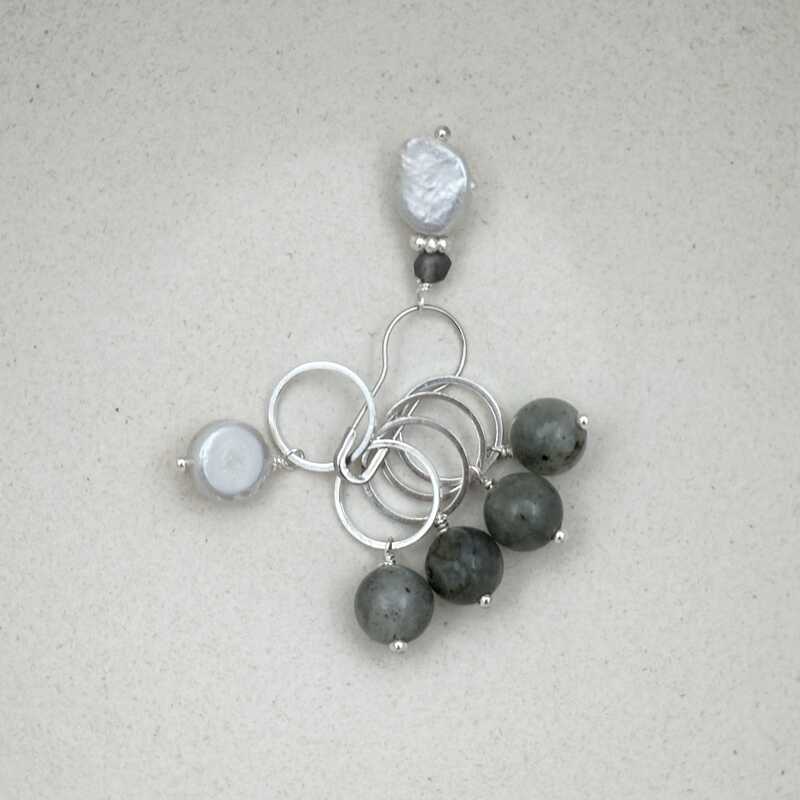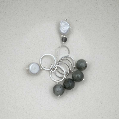 Forsølvede glatte flade markørringe - 4 med grå labarodit perler og 1 grå ferskvandsperle; Samt en rækkemarkør med grå ferskvandsperle.